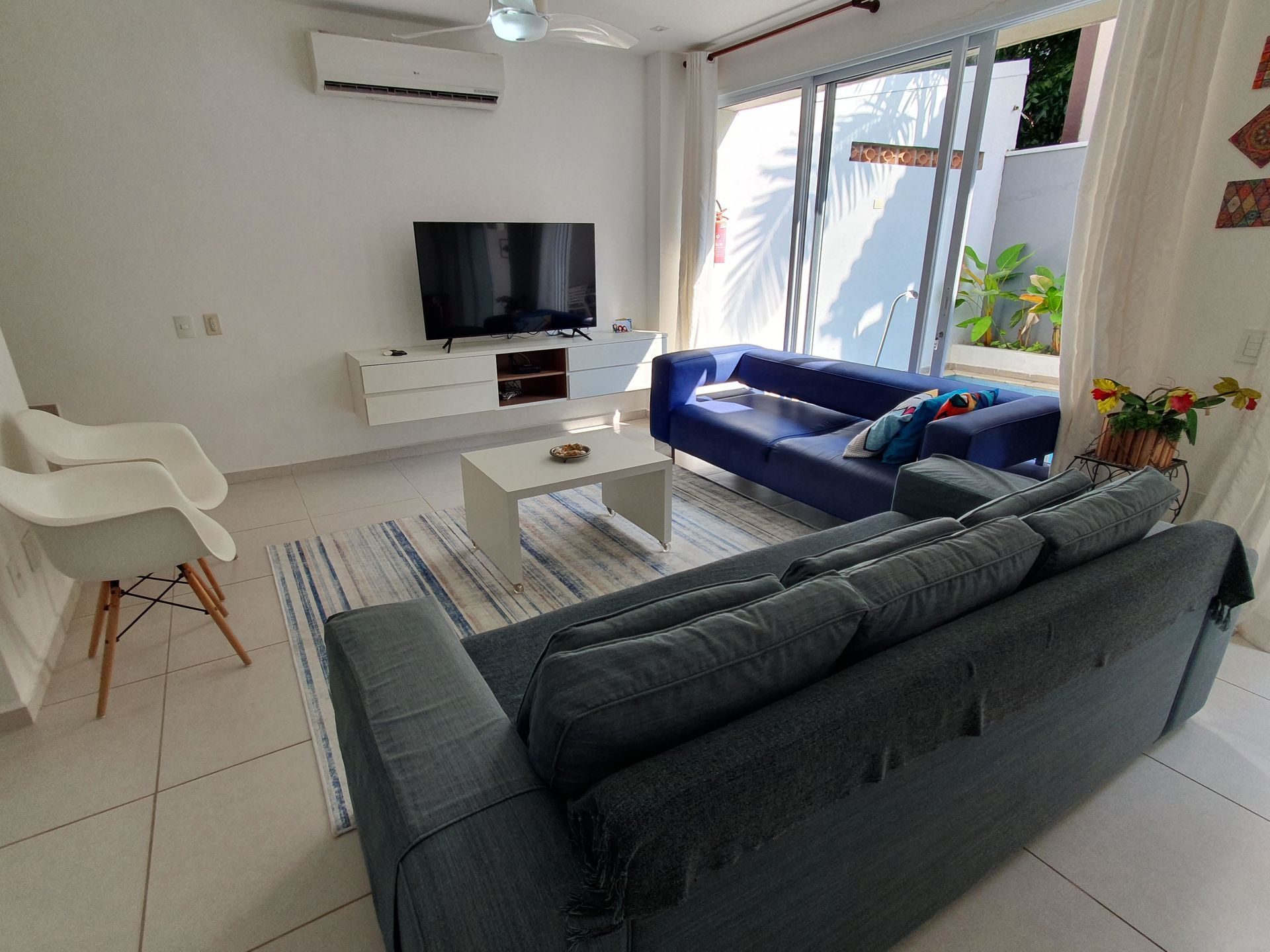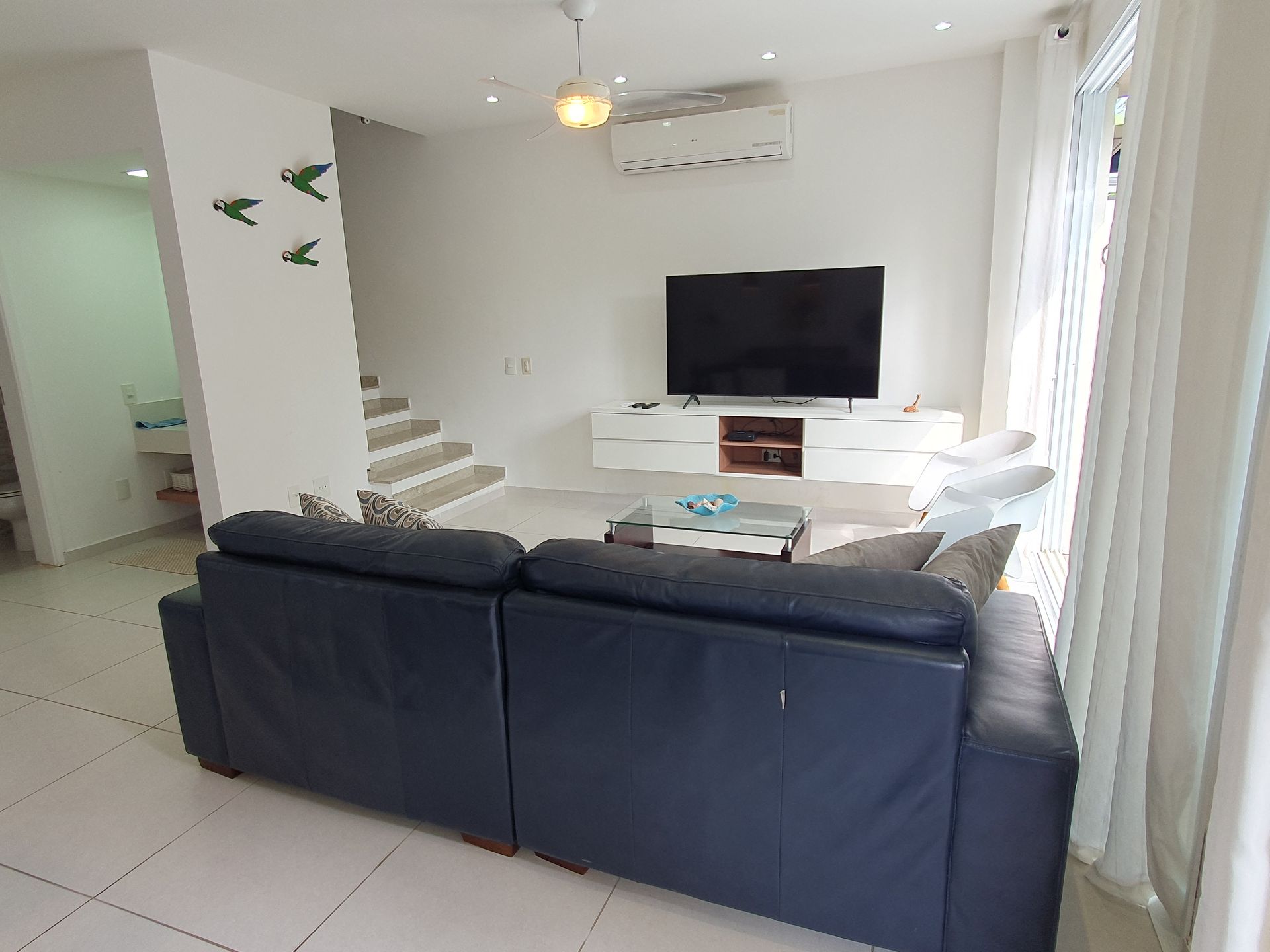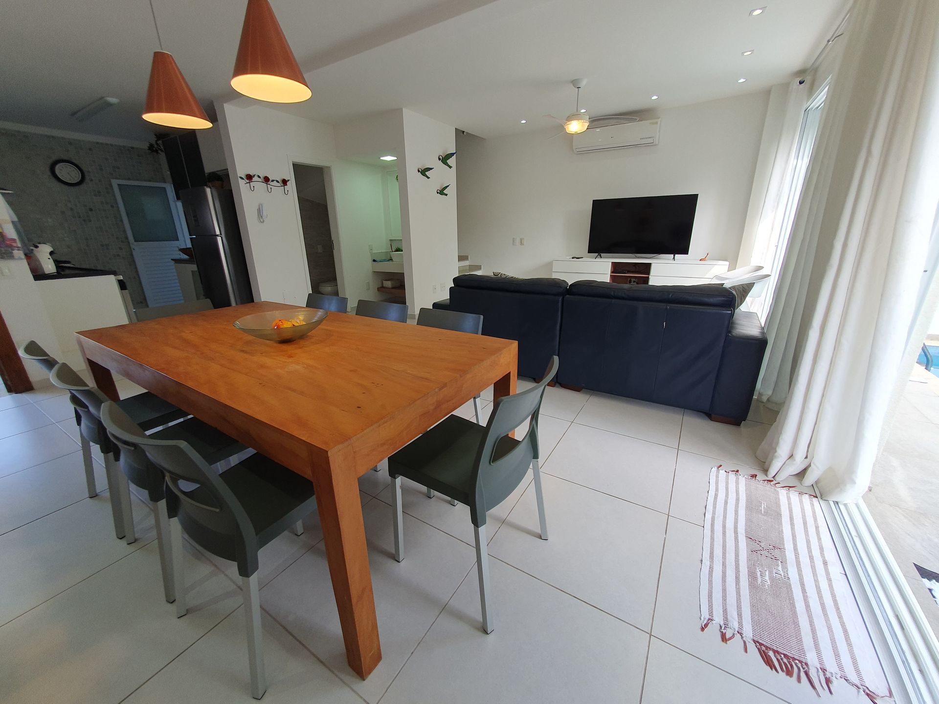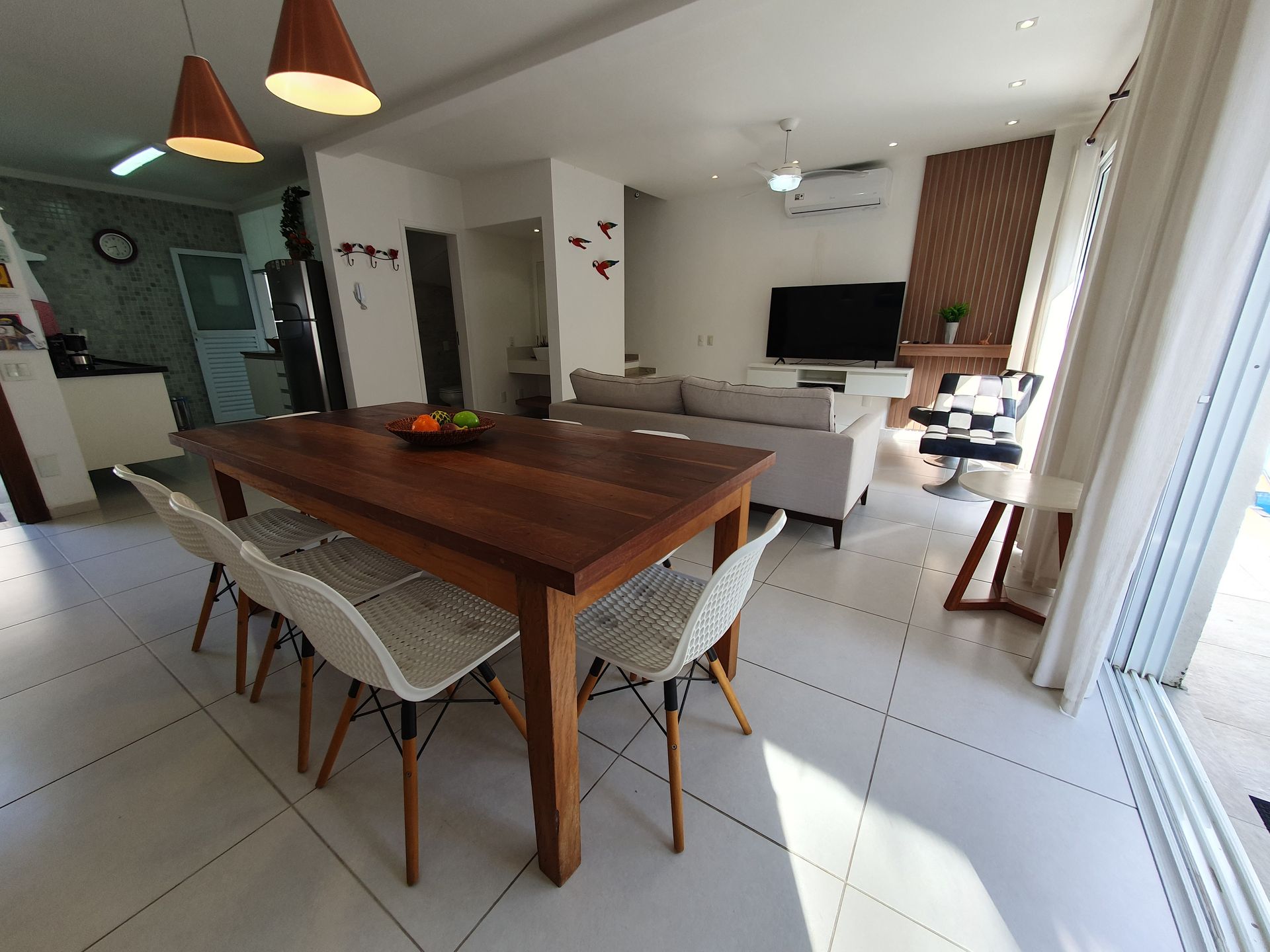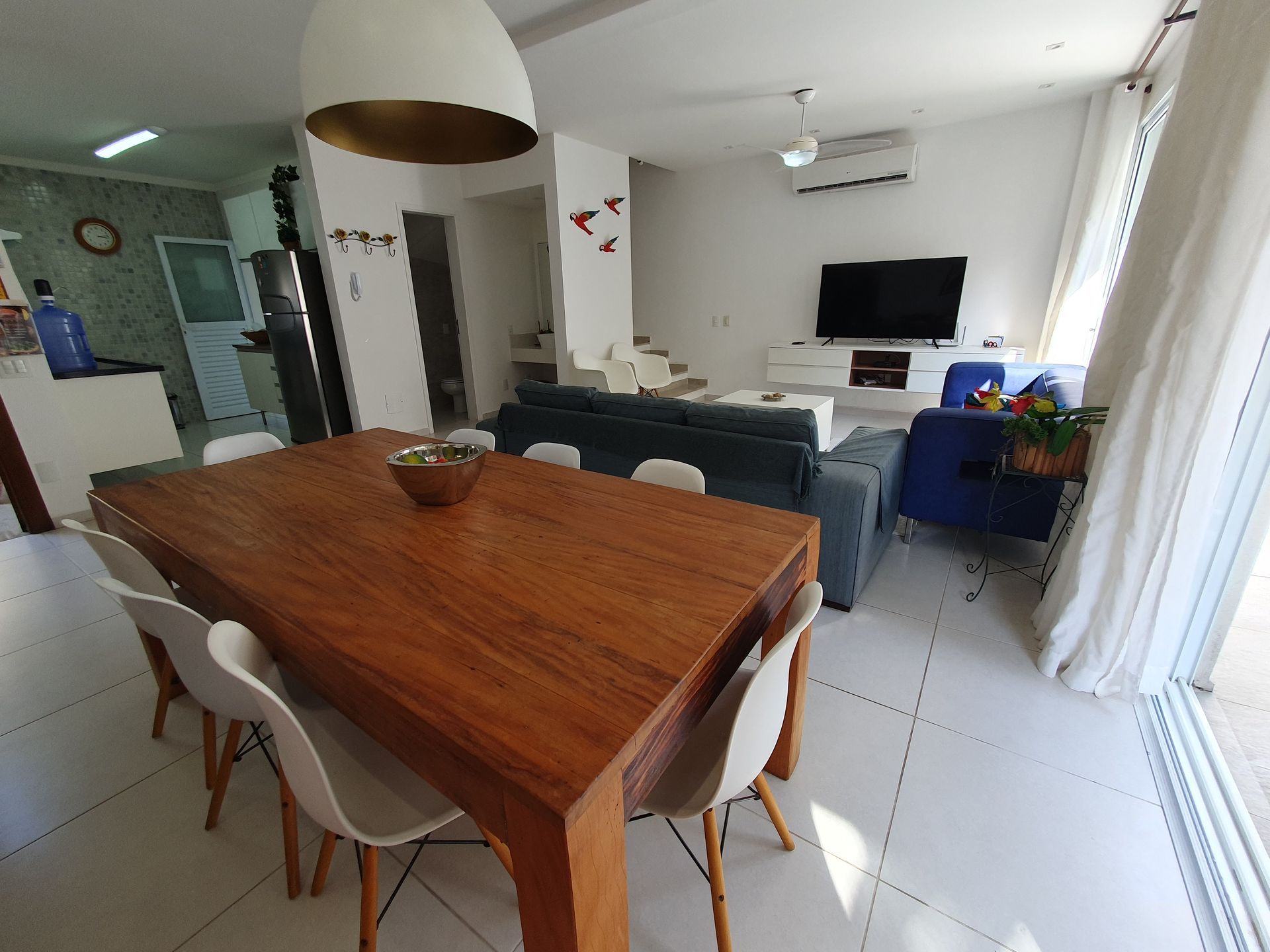 Sala com dois ambientes, de estar e jantar, equipada com ar condicionado e ventilador de teto. Cozinha equipada.