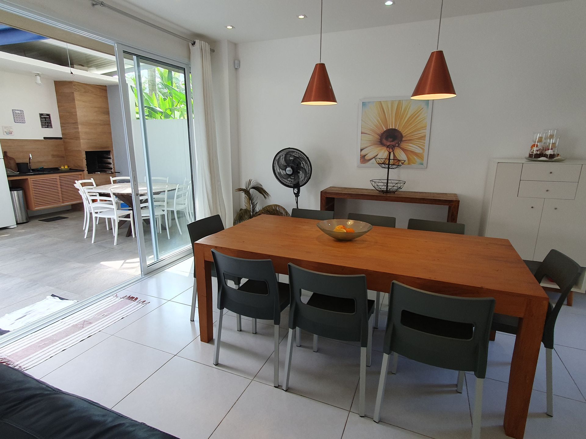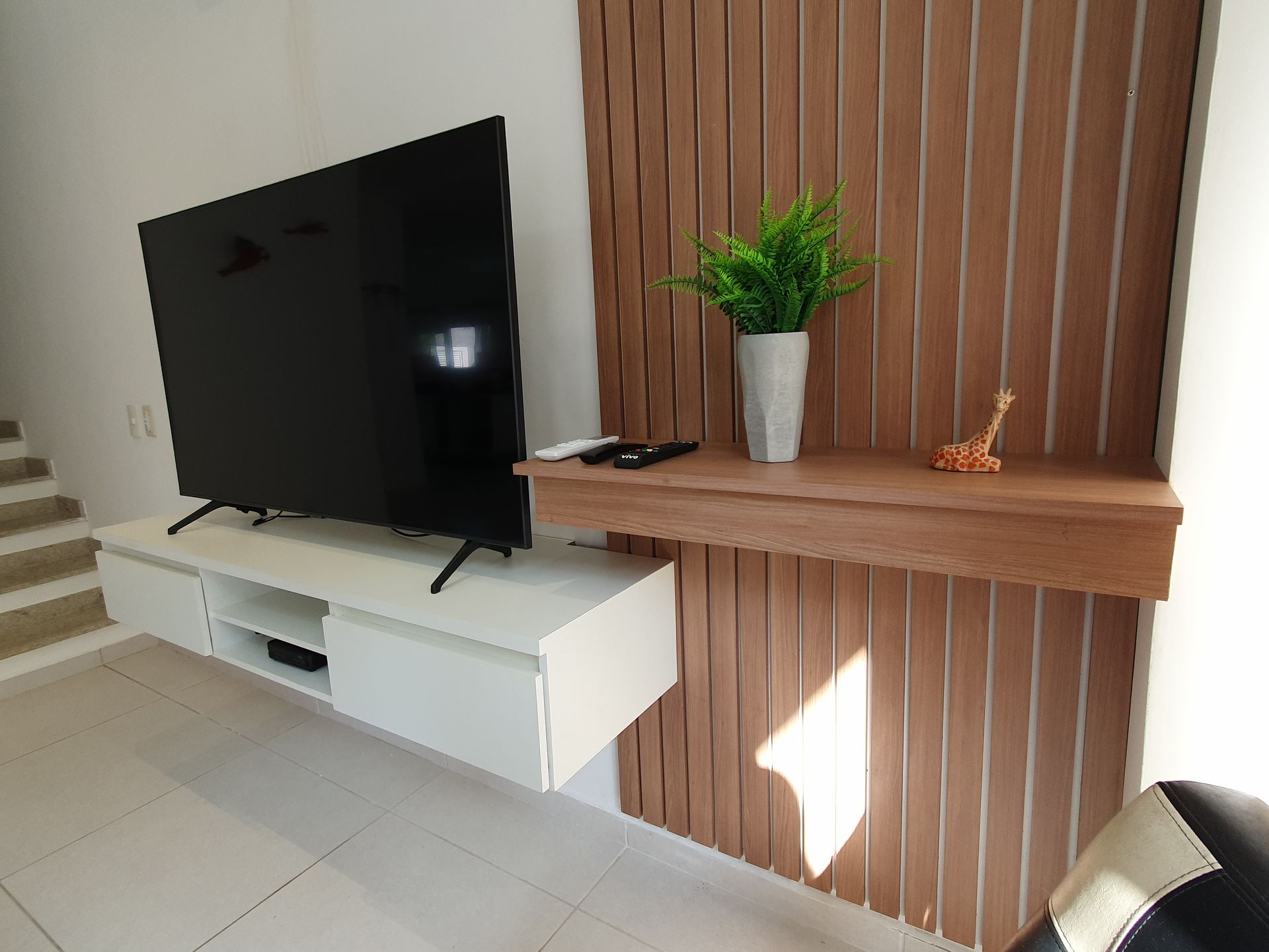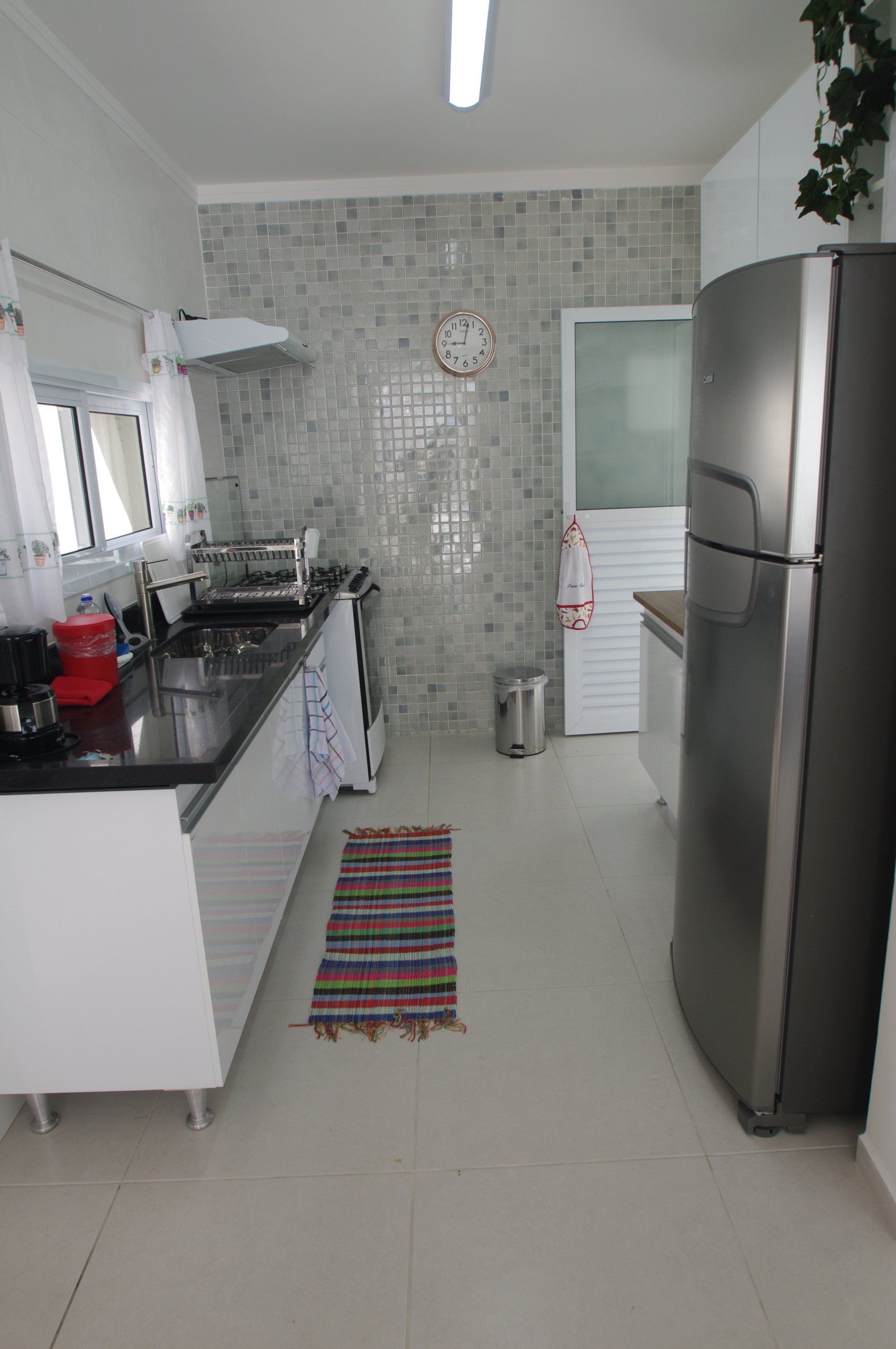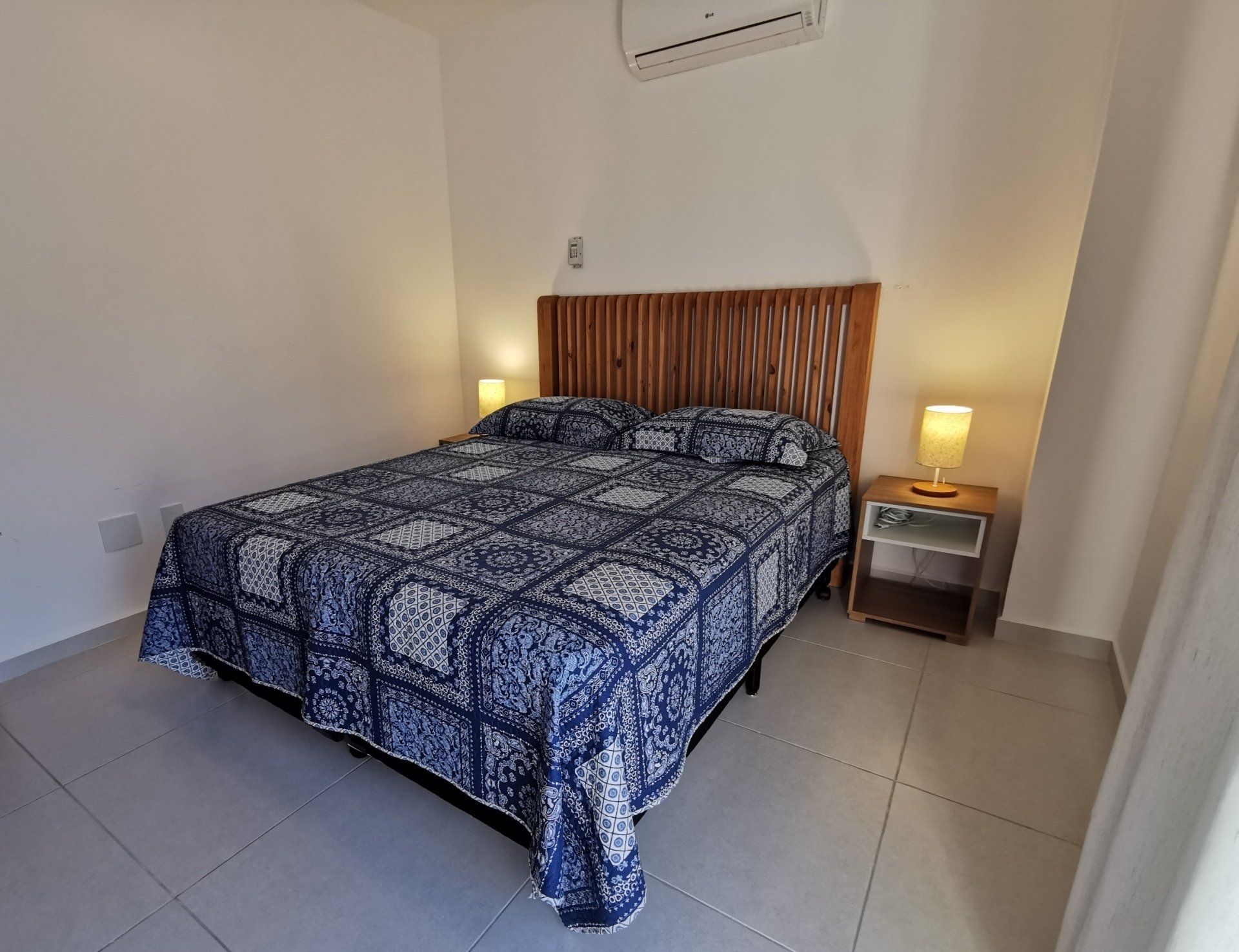 Sala com dois ambientes, de estar e jantar, equipada com ar condicionado e ventilador de teto. Cozinha equipada.