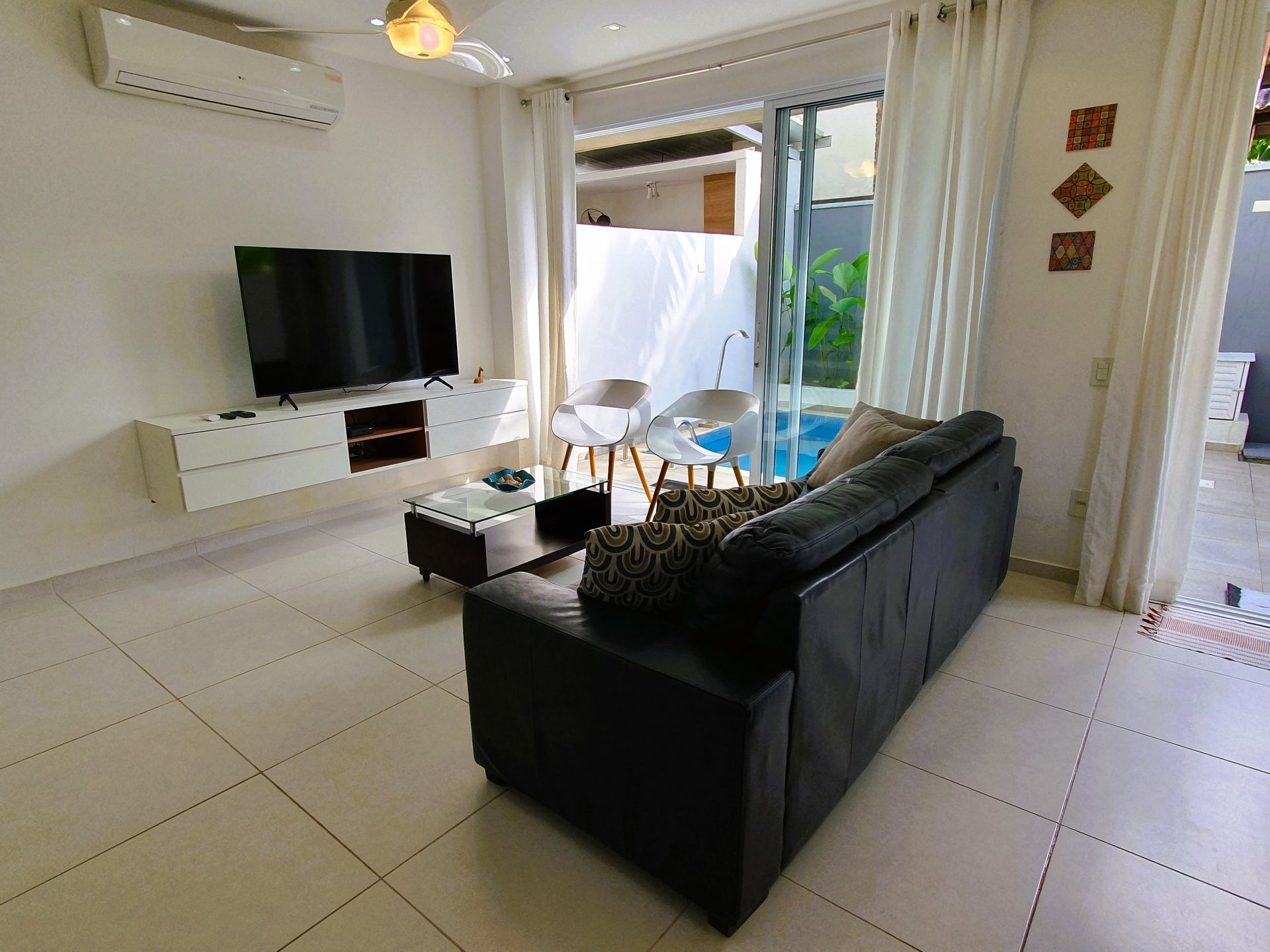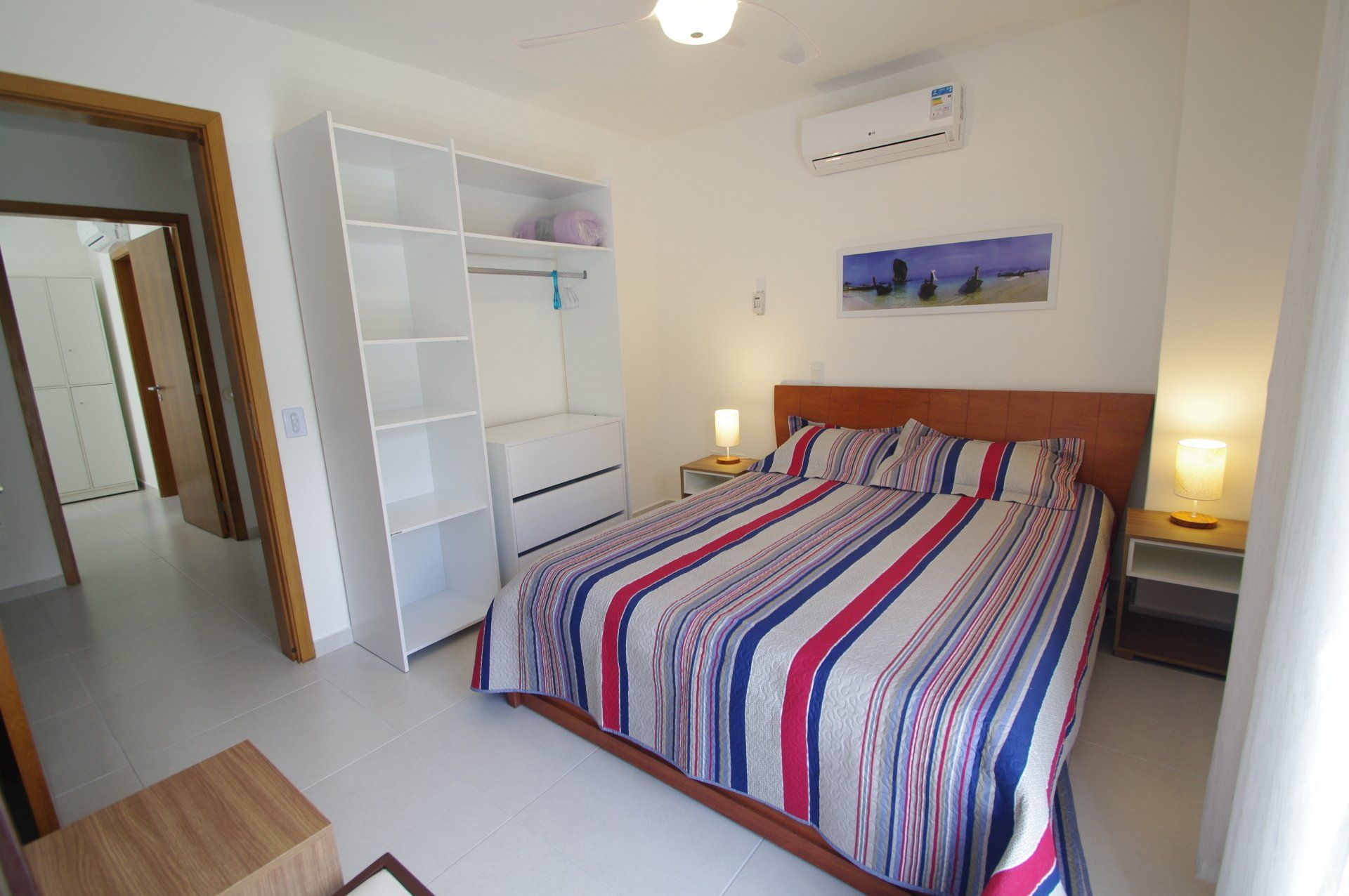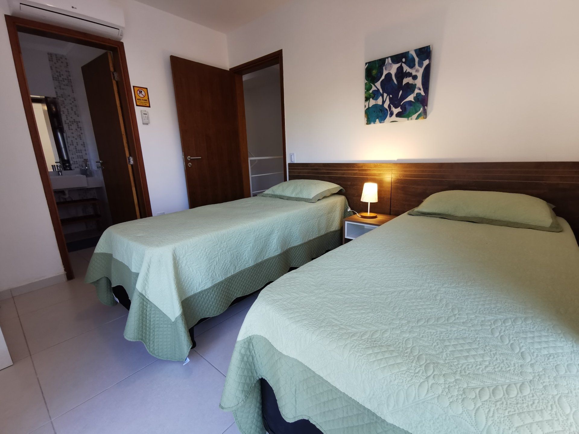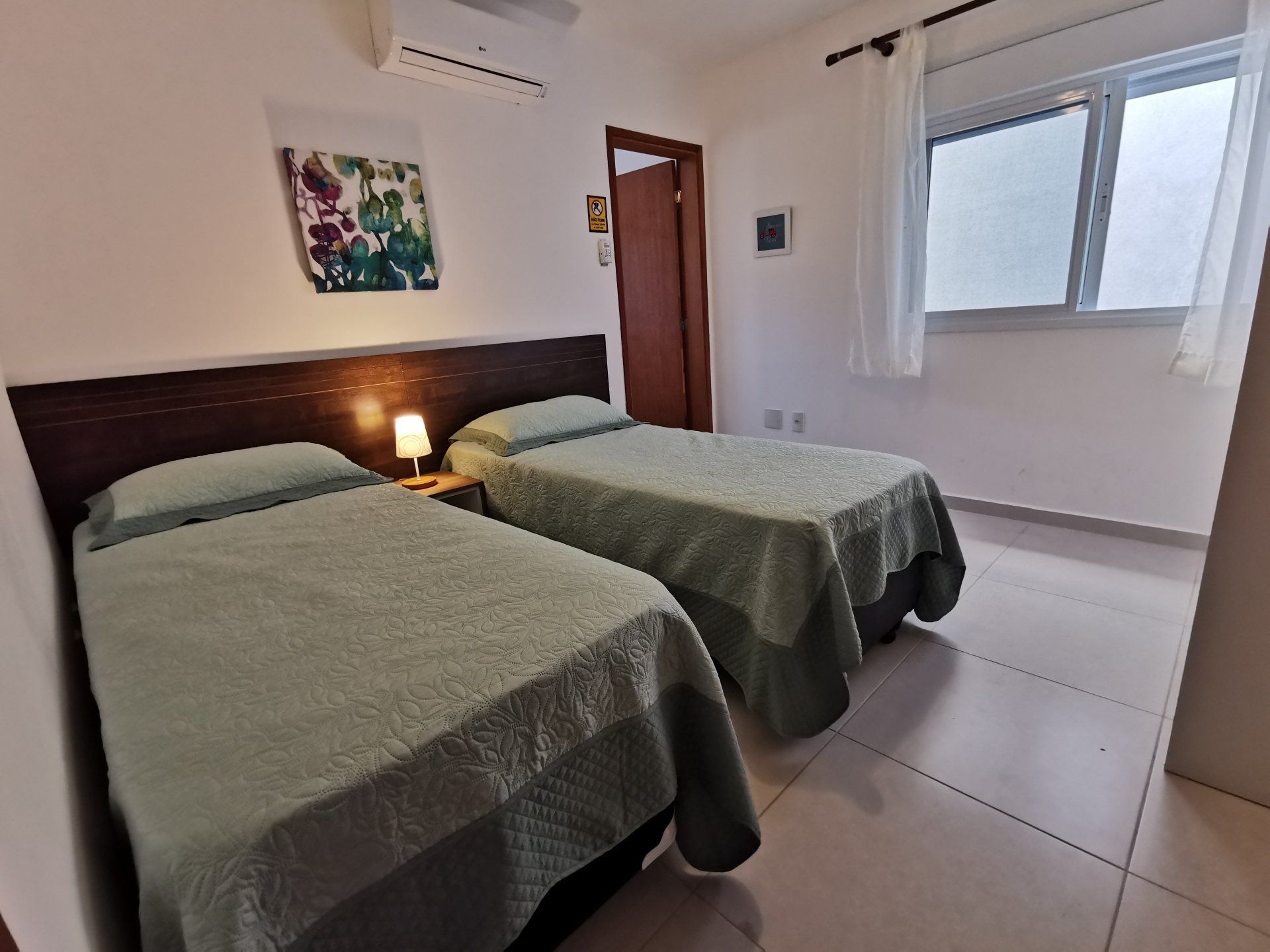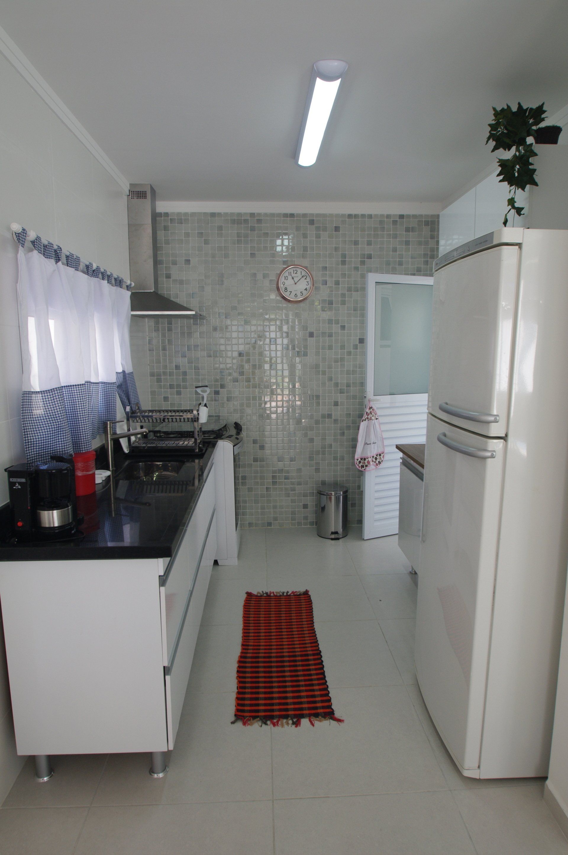 Sala com dois ambientes, de estar e jantar, equipada com ar condicionado e ventilador de teto. Cozinha equipada.